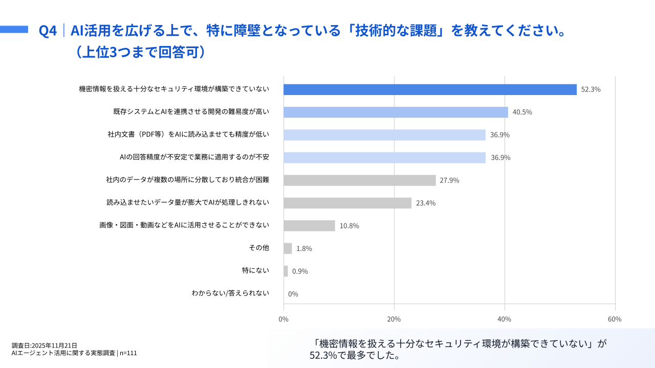 「Q4.AI 活用を広げる上で、特に障壁となっている『技術的な課題』を教えてください。(上位3つまで回答可)」(n=111)と質問したところ、「機密情報を扱える十分なセキュリティ環境が構築できていない」が 52.3%、「既存システムと AI を連携させる開発の難易度が高い」が 40.5%という回答となりました。