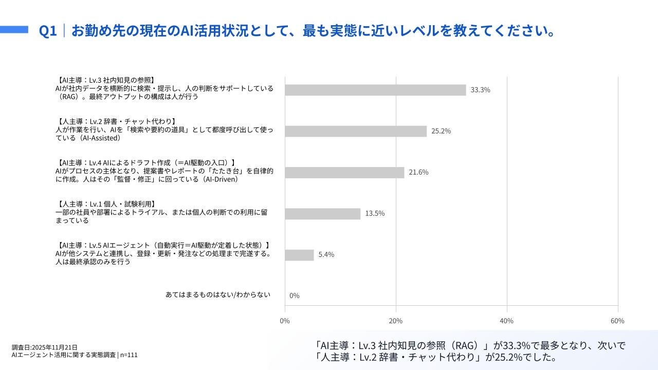 「Q1.お勤め先の現在の AI 活用状況として、最も実態に近いレベルを教えてください。」(n=111)と質問したところ、「AI 主導:Lv.3 社内知見の参照(RAG)」が33.3%、「人主導:Lv.2 辞書・チャット代わり」が 25.2%という回答となりました。