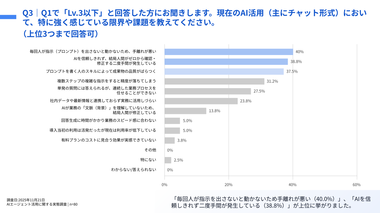 Q1で「Lv.3以下」と回答した方に、「Q3.現在の AI 活用(主にチャット形式)において、特に強く感じている限界や課題を教えてください。(上位 3 つまで回答可)」(n=80)と質問したところ、「毎回人が指示(プロンプト)を出さないと動かないため、手離れが悪い」が 40.0%、「AI を信頼しきれず、結局人間がゼロから確認・修正する二度手間が発生している」が 38.8%という回答となりました。