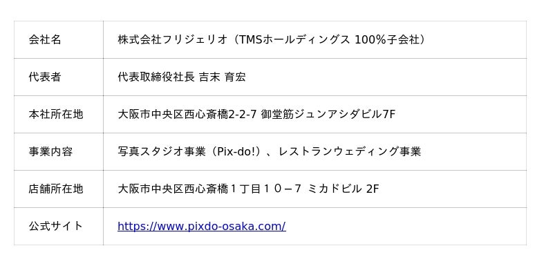 株式会社TMSホールディングスの子会社である株式会社フリジェリオ(本社:大阪市中央区、代表取締役:吉末 育宏)は、写真スタジオ事業「Pix-do!(ピックスドゥ)」の運営を、2026年2月1日付で継承したことをお知らせいたします。