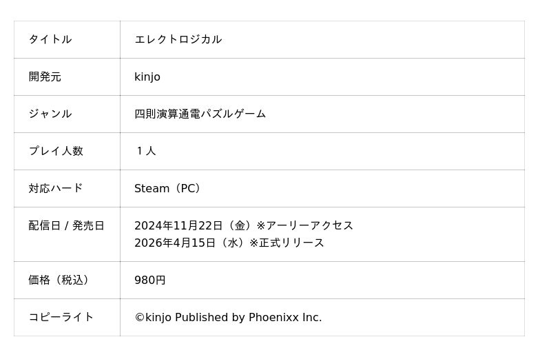 株式会社Phoenixx(フィーニックス)(東京都武蔵野市、代表取締役社長:坂本 和則)は、四則演算通電パズルゲーム『エレクトロジカル』の正式リリース版を、2026年4月15日(水)よりSteamにて配信開始したことをお知らせいたします。
