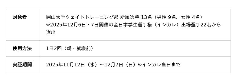医療用品メーカーのダイヤ工業株式会社(本社:岡山県岡山市 代表取締役:松尾浩紀)のグループ企業である、口腔ケア事業を展開する株式会社メディカルクラフトン(本社:岡山県岡山市 代表取締役:松尾健哉)は、国立大学法人 岡山大学のウェイトトレーニング部と連携し、アスリートにおける口腔ケアの重要性をテーマとした実証実験を開始いたしました。実験期間は2025年11月12日~12月7日の約1か月間です。選手の口腔ケアを通じて、ベストコンディションの維持と競技パフォーマンス(競技結果)のさらなる向上を目指します。