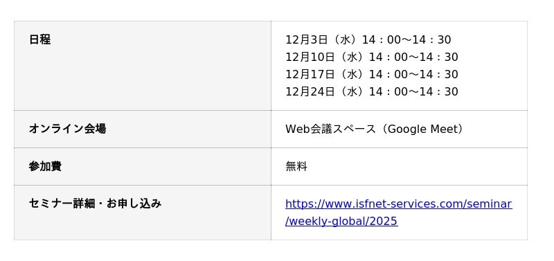 セミナーお申し込みはこちら:https://www.isfnet-services.com/seminar/weekly-global/2025