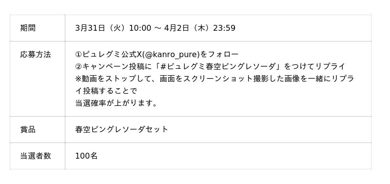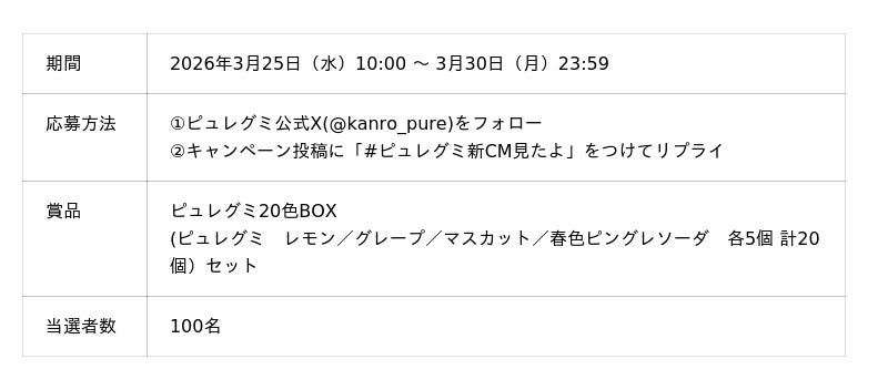 新TVCM公開を記念し、ピュレグミオリジナルミラーや、ピュレグミのカラーパッケージ全色セットなどが当たるキャンペーンをピュレグミ公式Xにて開催します。