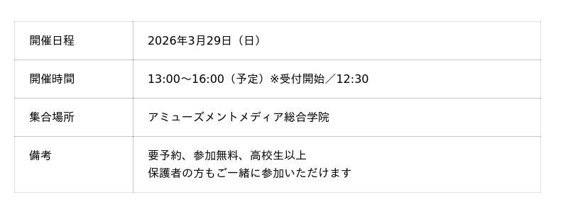 AMGのオープンキャンパスでは、学院や学科について詳しく解説する説明会に加え、ゲストをお招きしたスペシャルイベントや体験型のイベントを行っています。