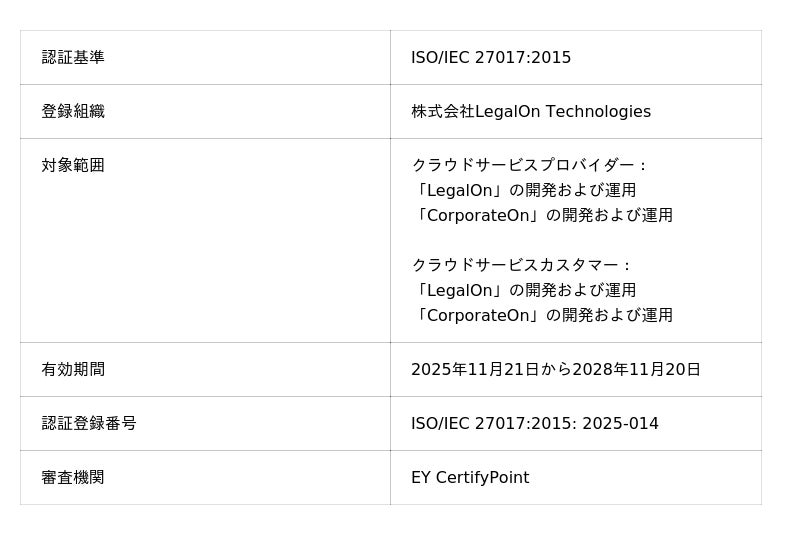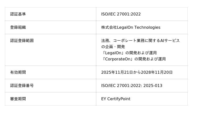 当社は、2018年12月にISMS認証を取得し、2021年12月にISMSクラウドセキュリティ認証を取得しております。今回の審査においては、グローバル統一のブランドである世界水準の法務AI「LegalOn」、AIカウンセル「CorporateOn」の認証を取得いたしました。特に、グローバルで提供している「LegalOn」については、国際基準に準拠した高いセキュリティと厳格なクラウドセキュリティ管理によって、世界中のお客様が安心してご利用いただけます。