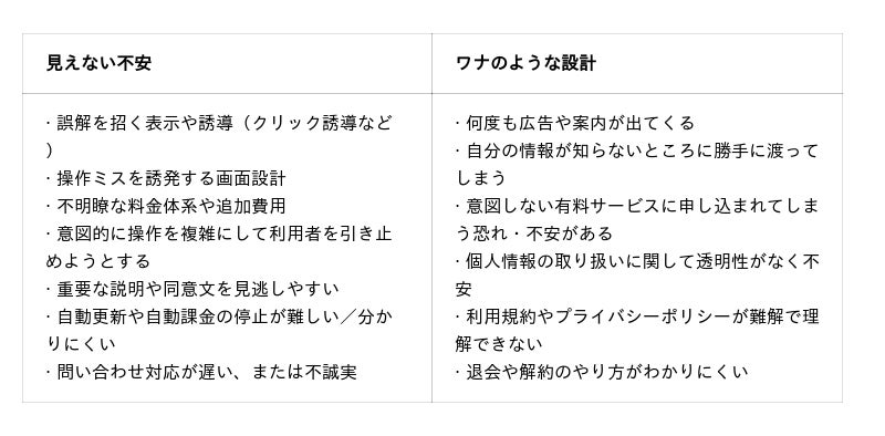 - 不信感の原因は「ワナのような設計」と「見えない不安」