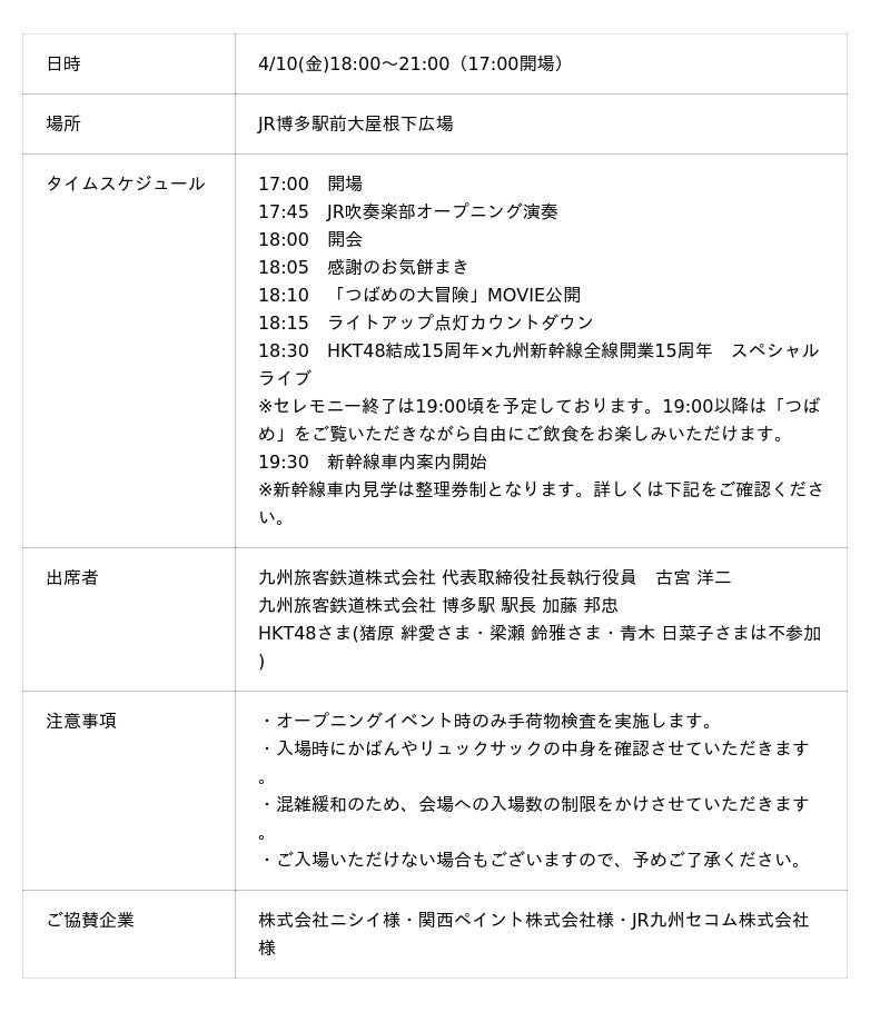 [表3: https://prtimes.jp/data/corp/37933/table/1173_3_6d276e4128eaa8bd298df7e33f267d46.jpg?v=202604060345 ]■ HKT48結成15周年×九州新幹線全線開業15周年 スペシャルライブの詳細情報
