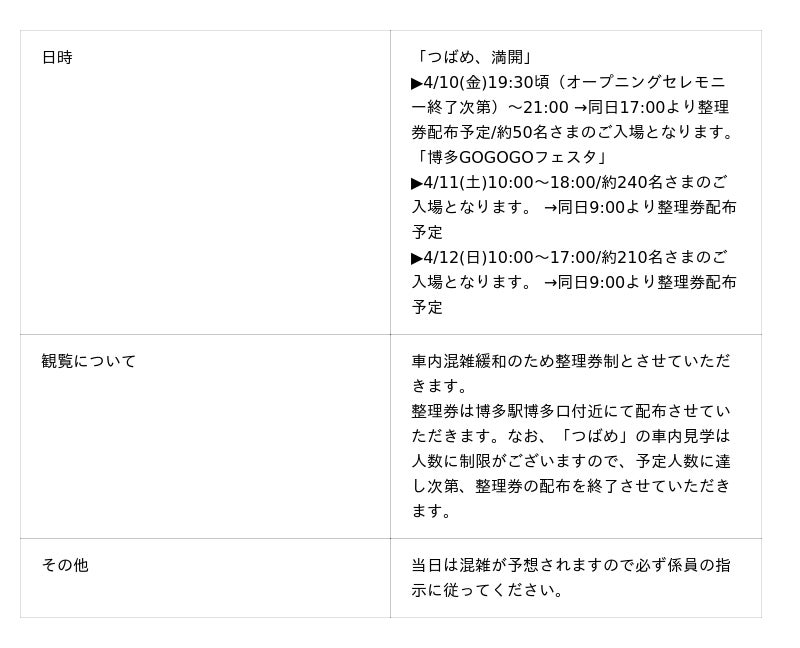 [表2: https://prtimes.jp/data/corp/37933/table/1173_2_b1c9bcf5312d48d734b2e0b26ffd681b.jpg?v=202604060345 ]博多駅前広場の簡易図面と「つばめ」車内見学整理券配布場所について