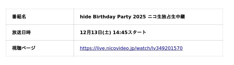hide(X JAPAN/hide with Spread Beaver/zilch)の誕生日12/13(土)14:45~「hide Birthday Party 2025」全編ニコ生独占生中継決定!