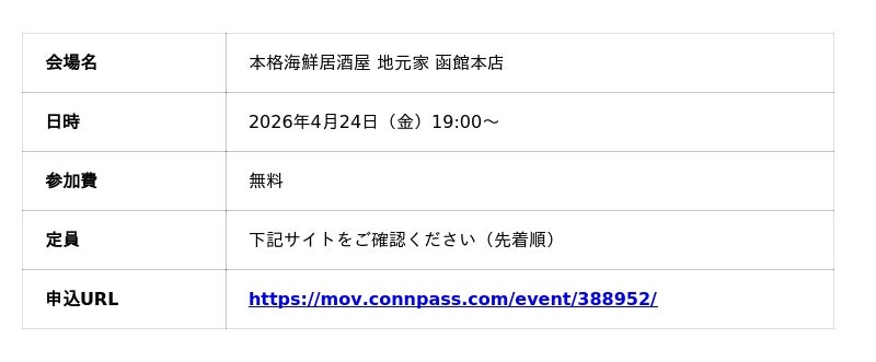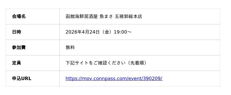 さらに、RubyKaigi 2026の最終日となる4月24日(金)に、函館市内の2箇所の会場にてDrinkupイベントを開催します。Rubyistはお好みの会場を選んで参加することが可能で、函館の海の幸を囲みながら、カジュアルに交流できる場を提供します。参加お申し込みは先着順となりますので、下記イベント詳細をご確認ください。