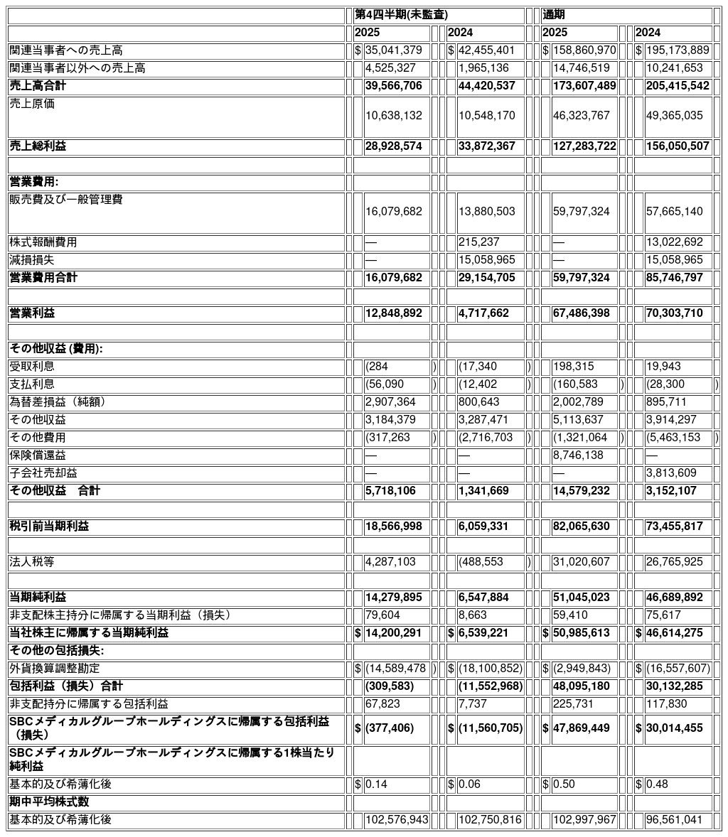 SBCメディカルグループ、2025年第4四半期及び通期決算発表(参考和訳版)