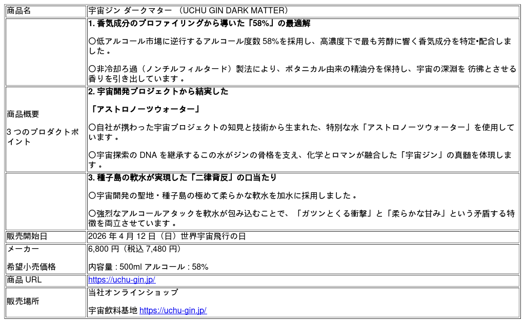 株式会社 ユニケミー(本社:愛知県名古屋市、代表:濱地 清市)は、クラフトジンブランド「宇宙ジン」シリーズの最新作として、アルコール度数 58% のハイプルーフジン『宇宙ジン ダークマター(UCHU GIN DARK MATTER)』を 2026 年 4 月 12 日(日)より公式オンラインストアにて発売いたします。ガスクロマトグラフ質量分析(GC/ MS)等の手法を用い、香りのピークを最大化させるレシピを開発。既存のジンの常識を覆す濃厚なジュニパーベリーの香りと、ほのかな甘み、そして強烈なアタックと新たな飲用体験を提供します。