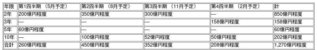 2026年度の鉄道・運輸機構債券の発行総額は1,270億円程度を予定しております。発行計画については、以下のとおり。(資金需要等により、調達額及び調達時期が変動する可能性があります)
